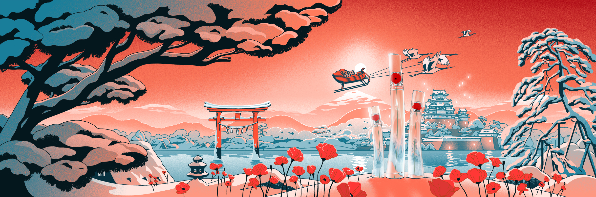 Pour la campagne de Noël des parfums Kenzo, le studio Costume 3 Pièces (agent du très talentueux illustrateur Vincent Mahé) a repensé les codes de Noël, en remplaçant les rennes qui tirent traditionnellement un traîneau plein de cadeaux, par des grues du Japon. C’est dans une usine enchantée que les parfums Kenzo sont préparés pour être offerts aux quatre coins du monde. Nous suivons donc les grues qui voyagent jusqu’à Paris, animées traditionnellement image par image.